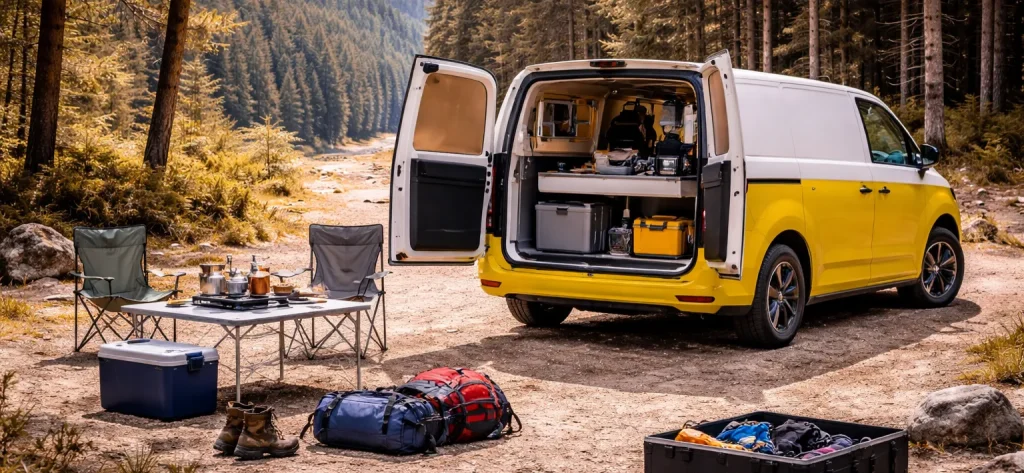 Many small vans and MPVs can be converted into compact campers using a removable camper pod. Popular vehicles include the VW ID Buzz Cargo, VW ID Buzz, Peugeot Partner, Renault Kangoo, and similar models that offer enough rear space for a sleeping platform and storage setup.